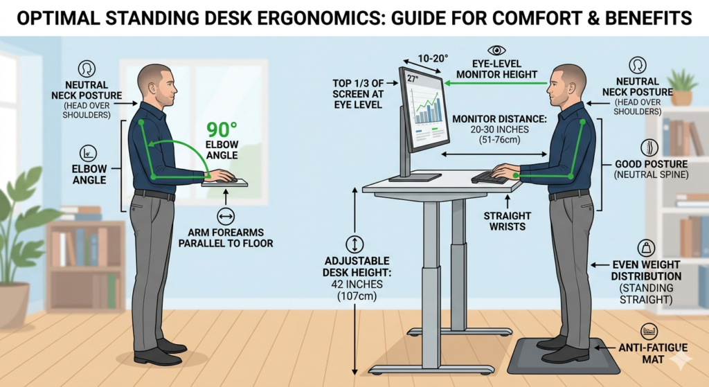 When standing comfortably with your shoulders relaxed, the desk surface should align exactly with your elbows, allowing your forearms to rest parallel to the floor at a 90-degree angle. The top third of your computer monitor should be directly at your eye level.