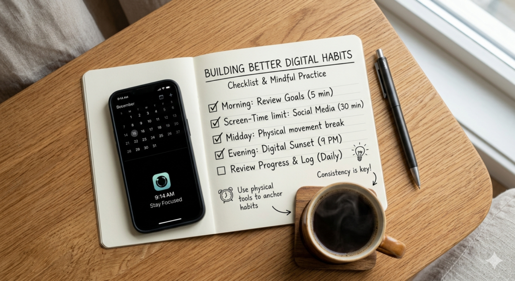 Habit stacking involves identifying a habit you already perform consistently every day and pairing your new desired behavior immediately after it. For example, if you already drink a cup of coffee every morning (current habit), you can stack a new digital habit onto it: “After I pour my coffee, I will leave my phone in the kitchen for 15 minutes.”