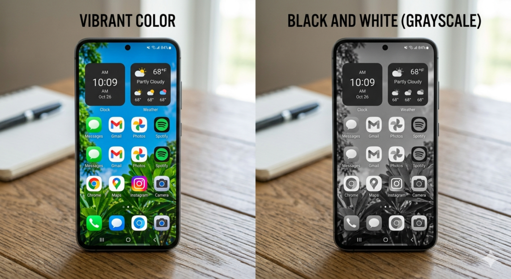 You can instantly neutralize this psychological trap by activating grayscale mode in your phone’s accessibility settings. This turns your entire screen into a dull black-and-white display.