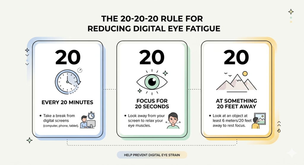 This is known as the 20-20-20 rule. Every 20 minutes, you should look at an object that is at least 20 feet away for a full 20 seconds. Looking into the distance allows the ciliary muscles—the muscles responsible for focusing on close objects—to completely relax.