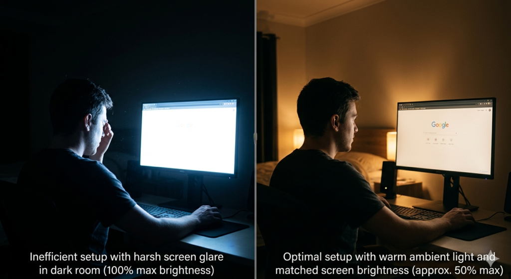 Your screen should never look like a glowing lightbulb in a dark room. High contrast between your monitor and the surrounding environment forces your pupils to continuously expand and contract, causing rapid fatigue.