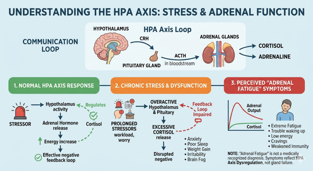 In alternative medicine, adrenal fatigue suggests that the adrenal glands are “burned out” and can no longer produce adequate hormones. However, mainstream endocrinology recognizes this phenomenon as Hypothalamic-Pituitary-Adrenal (HPA) axis dysfunction. The glands themselves are usually fine, but the brain’s signaling system has become entirely dysregulated by constant stress.